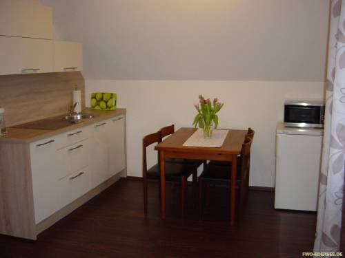 Die Küche verfügt über eine moderne Küchenzeile, die mit vier Herdplatten, einem Kühlschrank, einer Mikrowelle und einer Spülmaschine ausgestattet ist. Außerdem ist ein Tisch für 4 Personen vorhanden. Mit einer Kaffeemaschine, einem Wasserkocher, einer großen Anzahl an Teller, Tassen und Besteck und einem schönen Ausblick aus dem Fenster steht einem gemütlichen Beisammensein bei Tisch nichts mehr im Wege. Küchenrolle, so wie Müllbeutel und Geschirrspülutensilien sind ebenfalls vorhanden